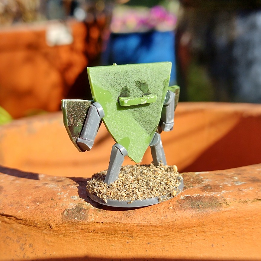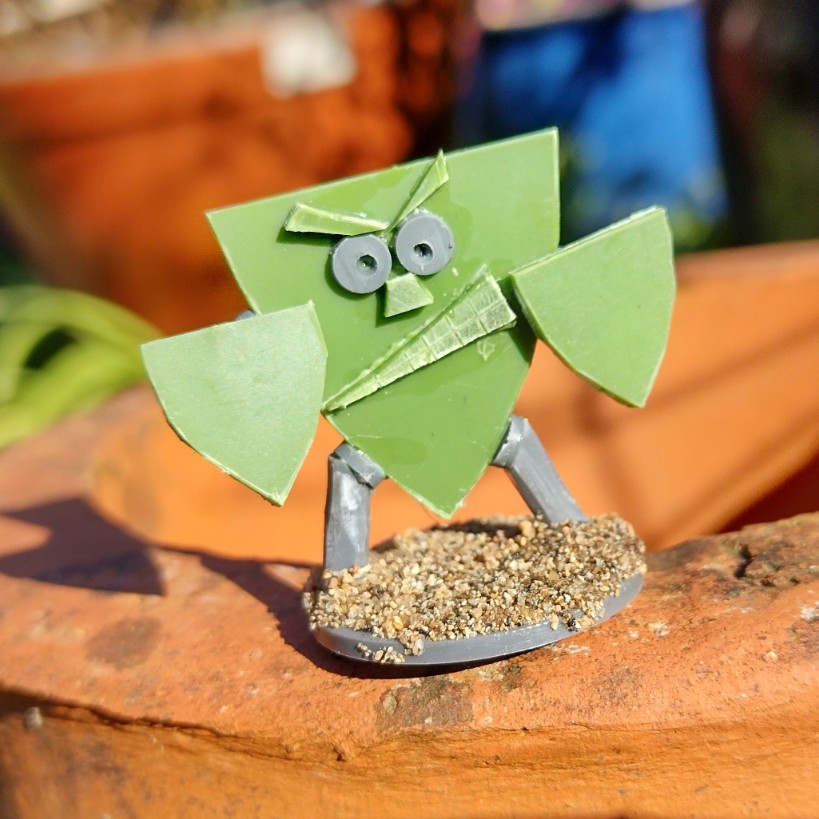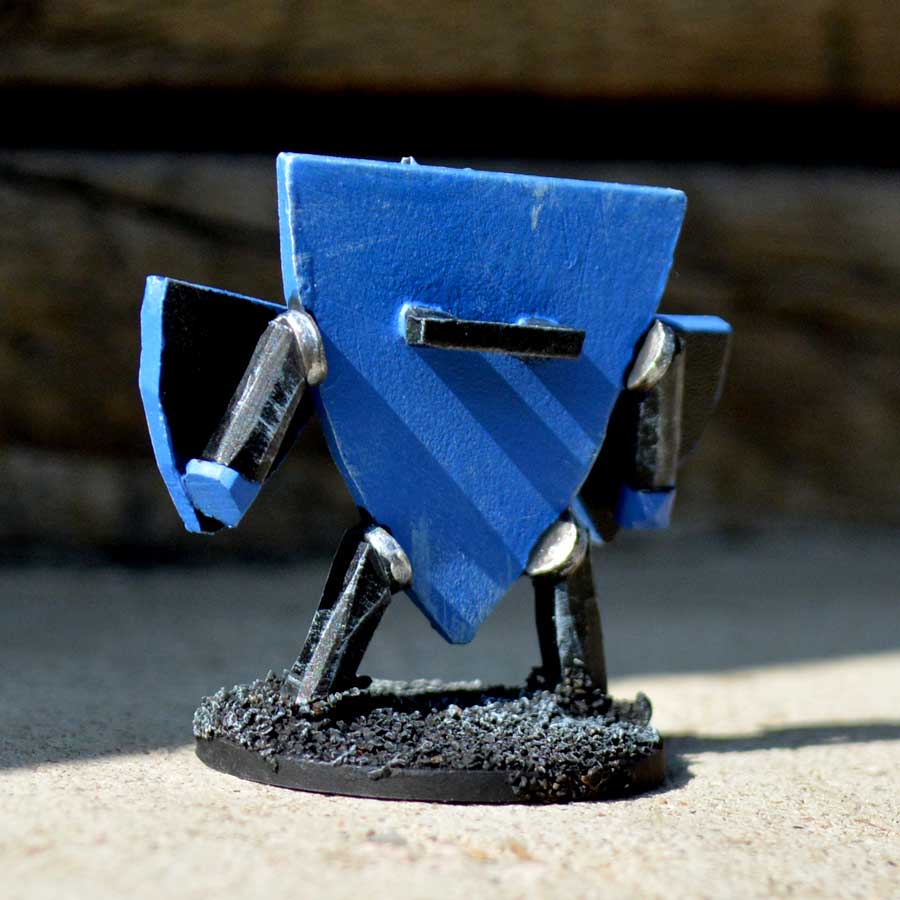 The build was incredibly easy. I grabbed an old square base and trimmed it into shield shape. Next, I added a face and limbs.